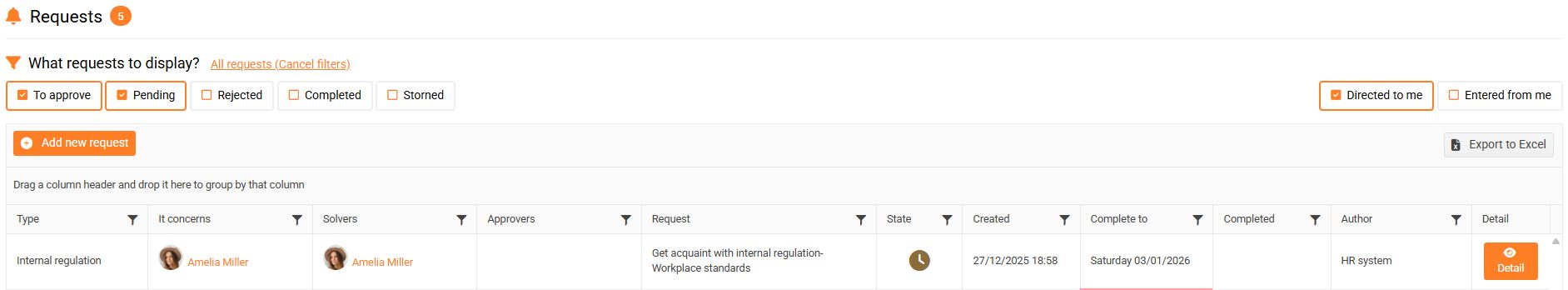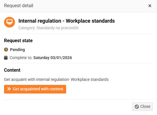 The request detail includes a button called Get acquainted the content , which redirects the employee directly to the given regulation.