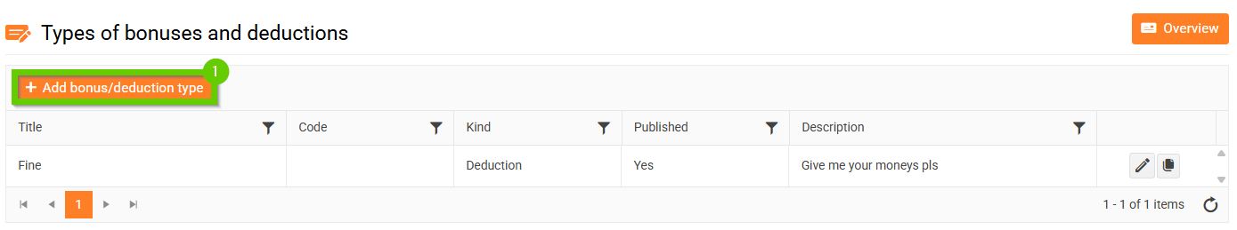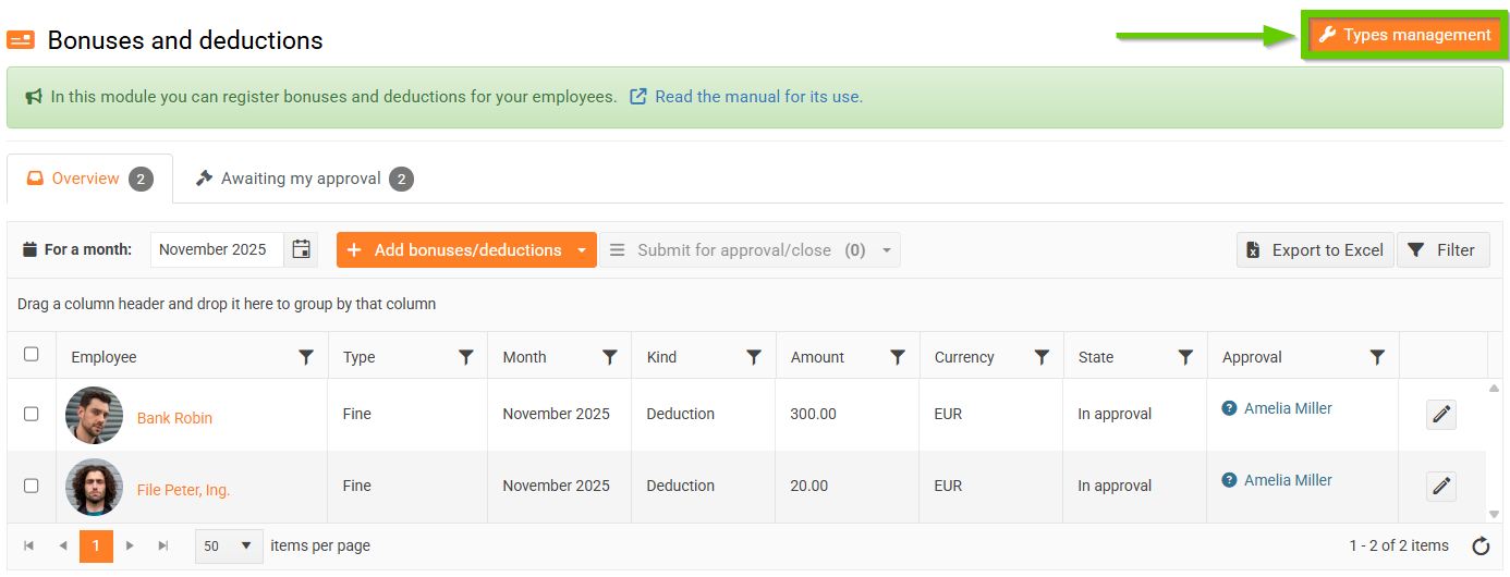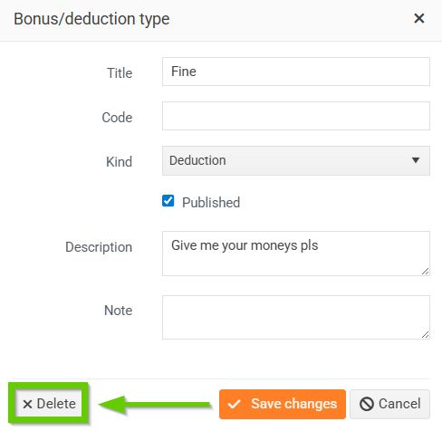 To manage bonuses and deductions, go to the HR > Bonuses and deductions > Types management tab in the main navigation menu.