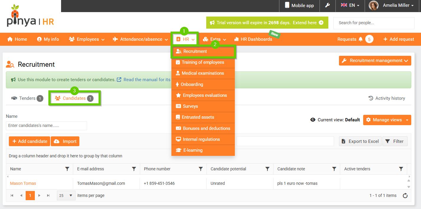 Go to HR > Recruiting > Candidates tab in the navigation menu.