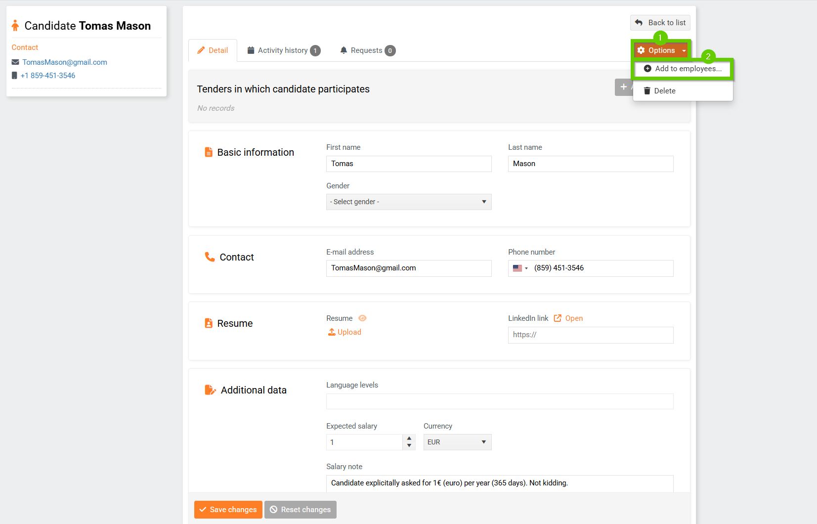 You can easily transfer a job applicant to your staff. Click on the profile of the candidate you want to hire. Select the Hire option.