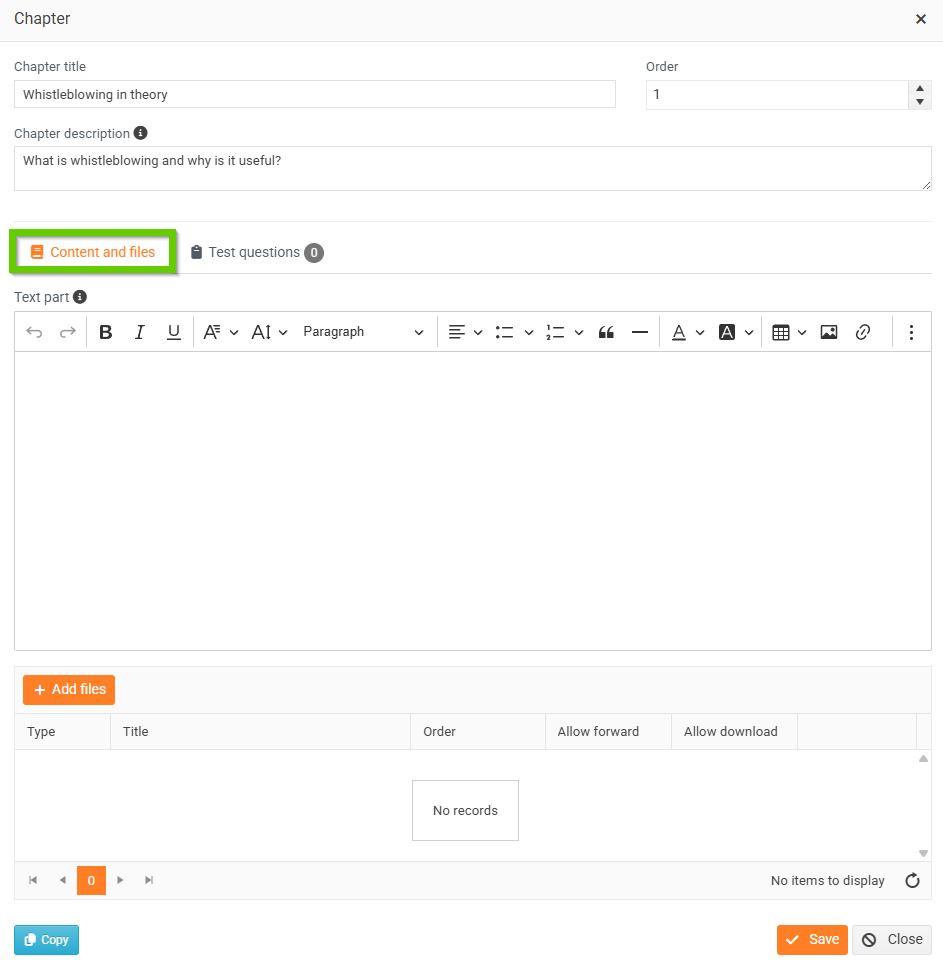 You can add files to the chapter content by clicking the Add files button. Allowed formats are PDF, MP4, PNG, JPG, JPEG, GIF. You can upload files in bulk or individually, the size of one file is limited to 500 MB.