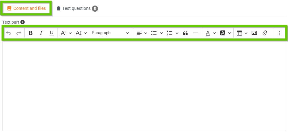 To insert text into the chapter content, use the integrated text editor, which allows you to format text, insert links and images, and format them.