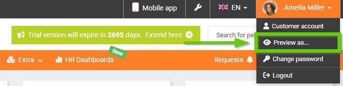 To view the system from an employee's perspective, click the drop-down with your name on the main bar in the upper-right corner of the page. Select the Preview as... function and then select the employee whose perspective you want to view the system from.