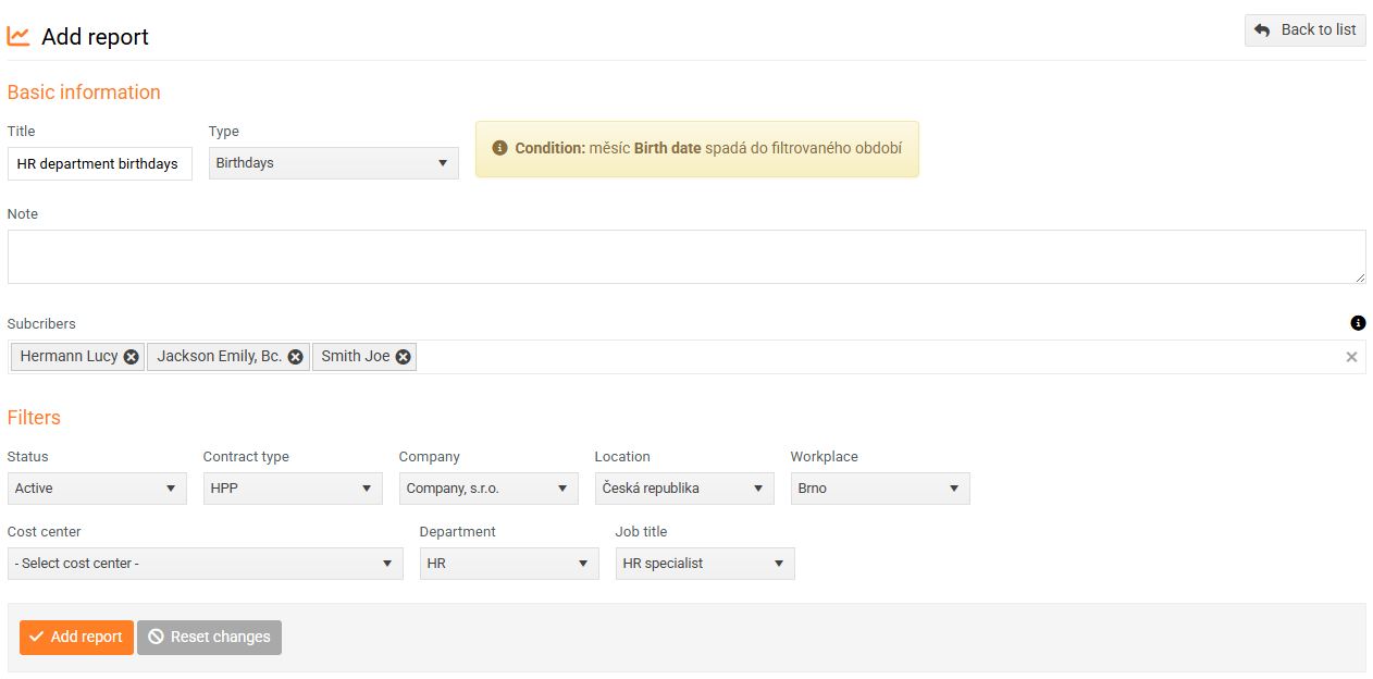 In the filters, it is possible to specify which group of employees will be included in the report. For example, if I include only employees working in HR positions in Brno in the Birthday report, the report will only cover those employees who have the relevant data filled in their employee profile in PINYA HR (Fig. 3).