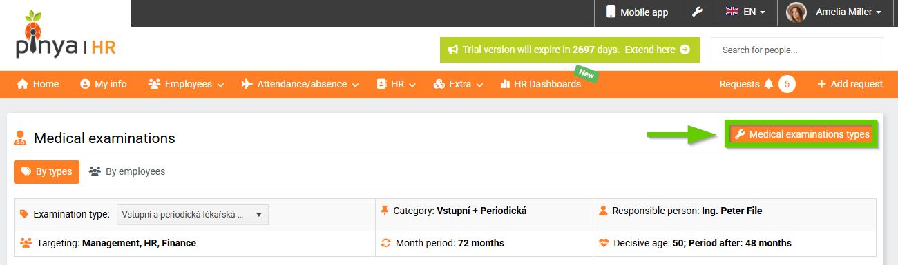 To manage medical examinations, go to the HR > Medical Examinations tab on the main dashboard.