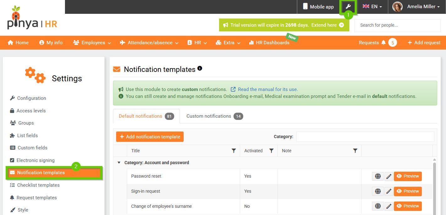 To set up notifications regarding employee departure, go to the main system settings - the Message Templates section.