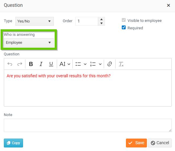 On the Question form, fill in the required fields. In the Who is answering field, select Employee and save the form.