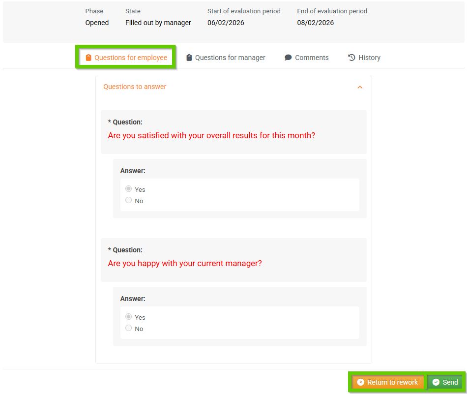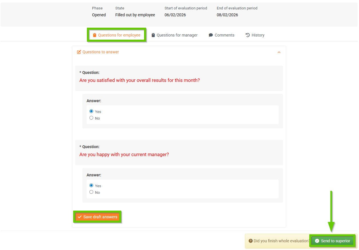 - Here, on the Employee Questions tab, they will answer the questions. If they click the Save draft answer button, they can return to the evaluation at any time and edit or complete it. The evaluation is in the Open phase and in the Employee Filling Out status.