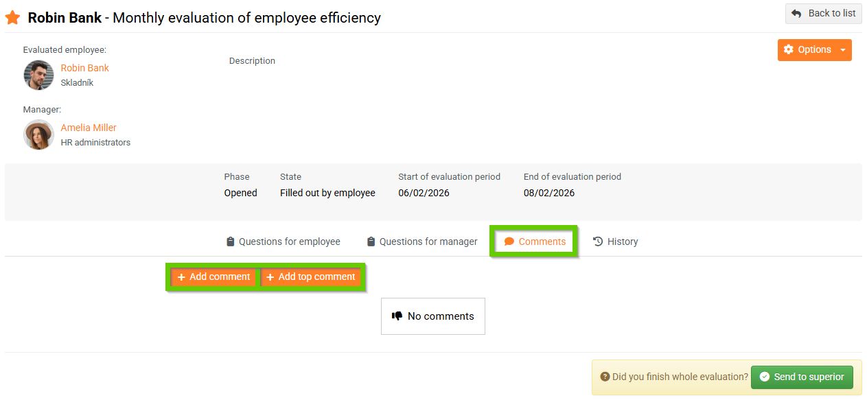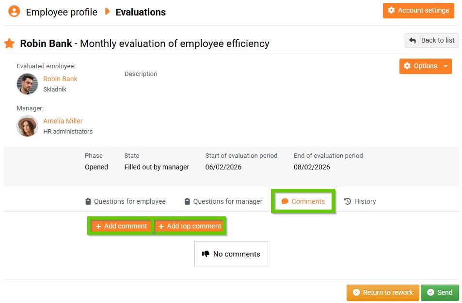 - On the Comments tab, the employee can add a comment to the evaluation.