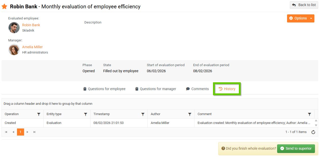 - On the History tab, the system automatically records all actions related to the given evaluation.