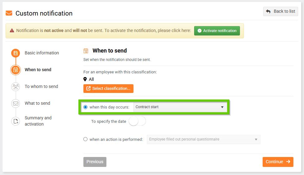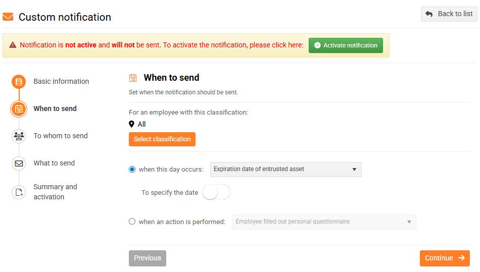 The notification sending date can be tied to various system dates, calendar days, or you can specify it exactly. You can also use data from custom fields.