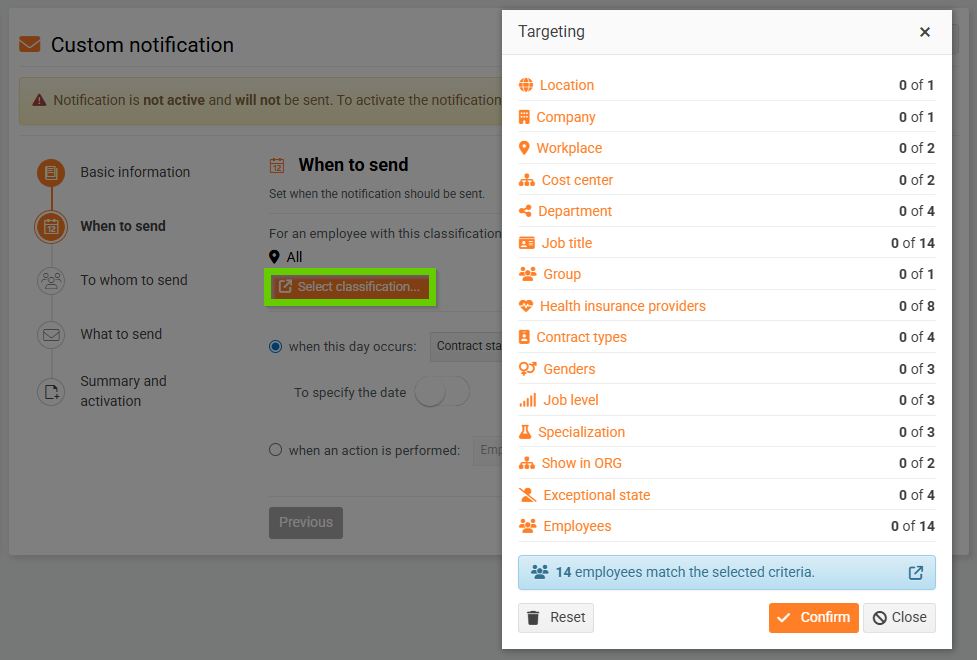 You can also specify which employees the notification will take into account - e.g. only certain job positions or only a certain group, etc. You are also familiar with this filter from other parts of the application such as Targeting: