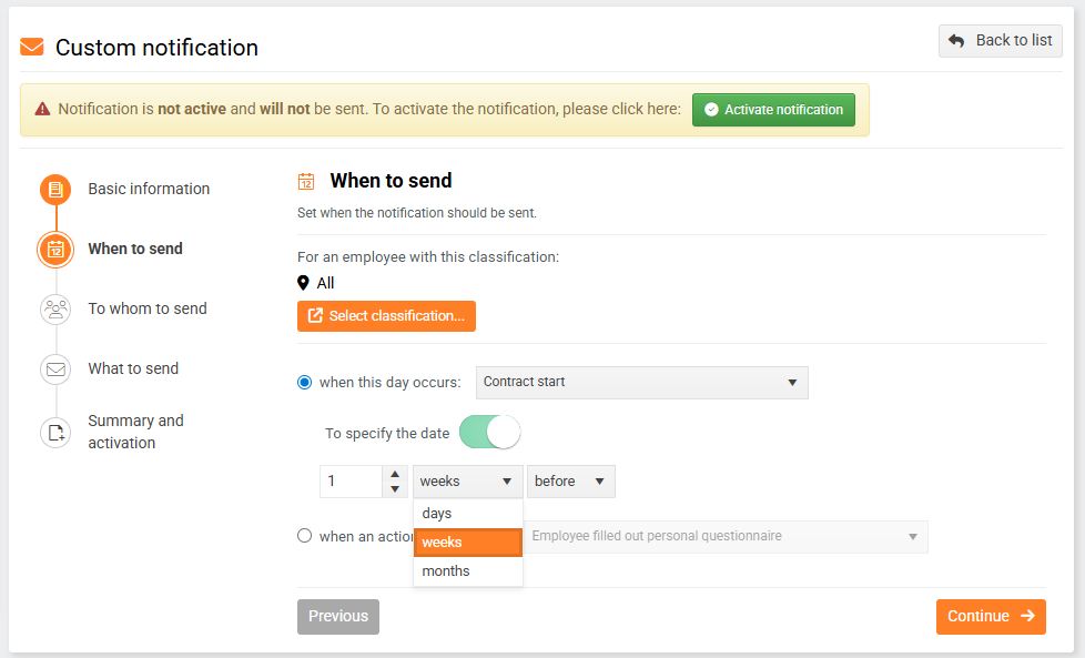 If the notification should not be sent directly on the selected date, but perhaps a few days/weeks/months before or after the deadline, turn on the Specify date switch. You will then be able to specify the day the notification will be sent.