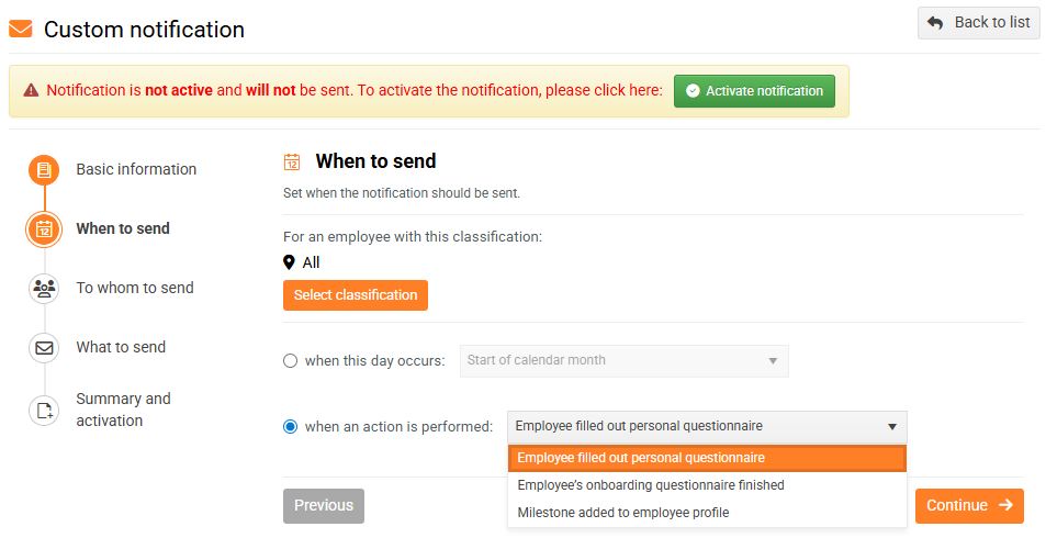 Selecting the "when action is performed" option is only possible for some categories (e.g. Employee, Document, Evaluation categories).