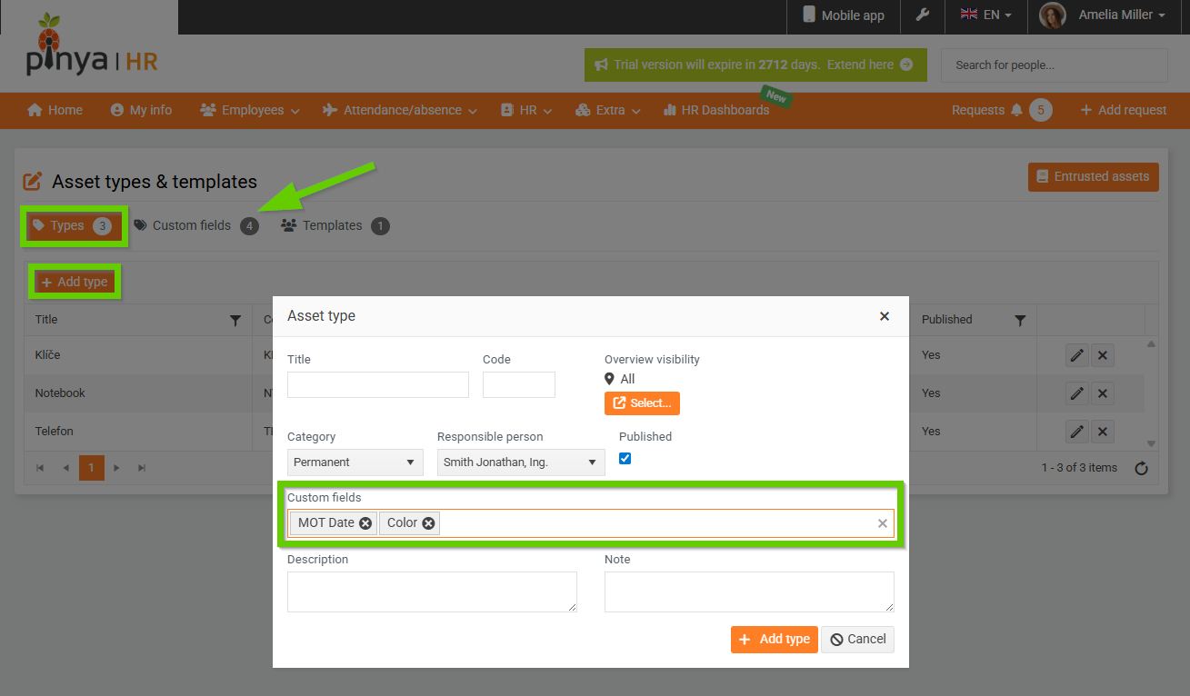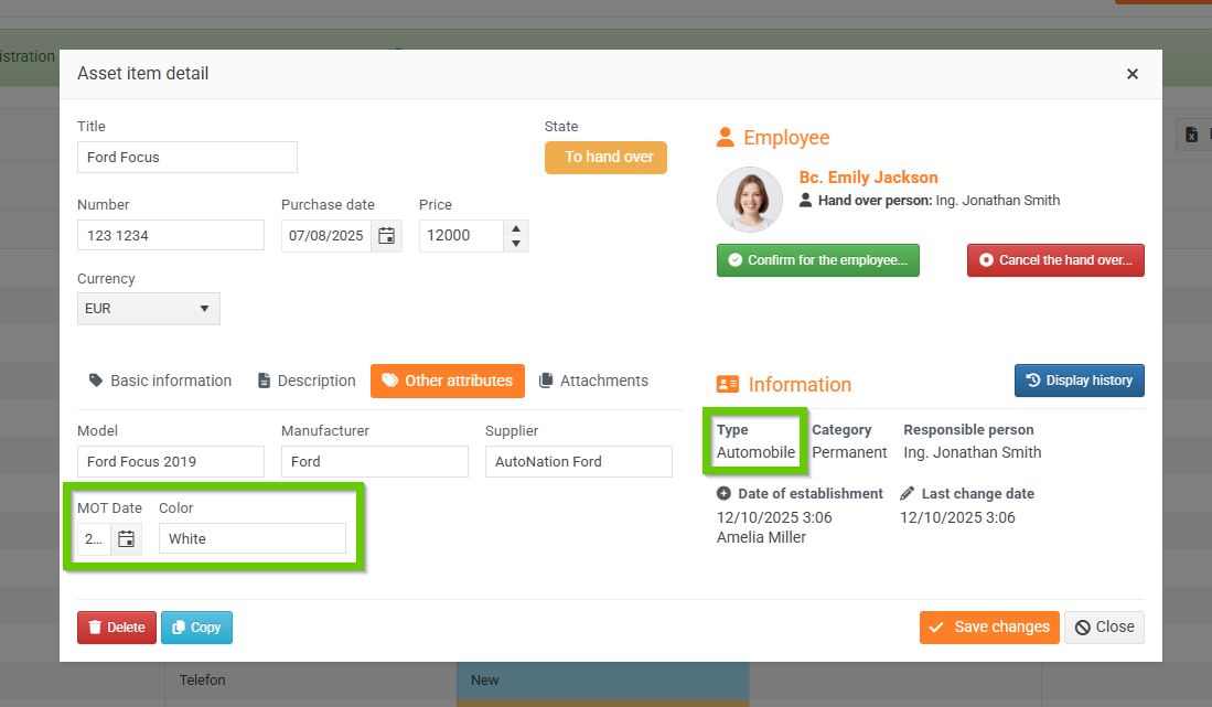 Custom attributes can be assigned to assets, such as color, size, material, MOT date, etc. These attributes can be of various data types - text, date, number, value selection, etc. (4)
