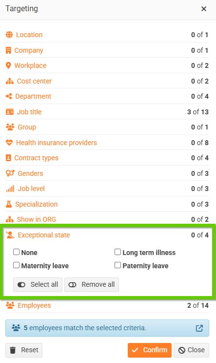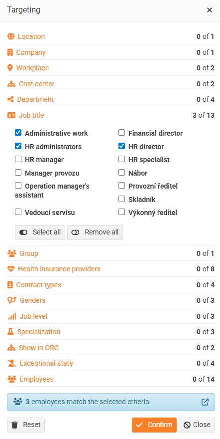 You have different categories available – for example Company, Department, Job title, Contract types, Health insurance providers, or Genders. For each of these categories, you can select one or more values. The more values you select across different categories, the narrower the result will be – the targeting system filters employees who meet all selected conditions simultaneously .