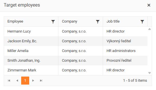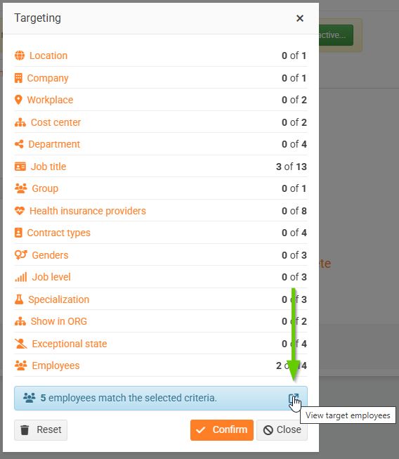 At the bottom of the window, you can always see how many employees are currently targeted by your current targeting. Clicking the Show Target Employees button opens a list of targeted employees. This allows you to easily check that everything matches your intent.