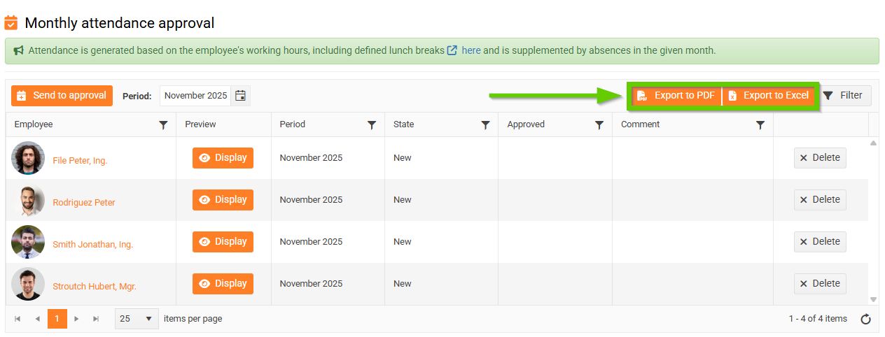 Here you can export individual attendance forms for the displayed employees.