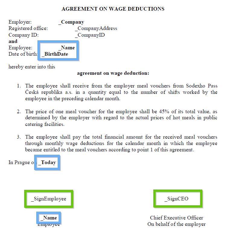 - Place the necessary signature tokens in the document where electronic signatures should appear (marked in green in the image).