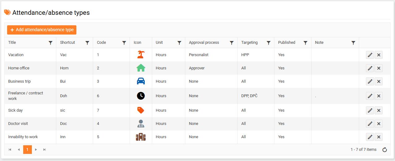 You can manage individual attendance/absence types by clicking the pencil icon on the right side of the page. Click the cross icon to delete a type.