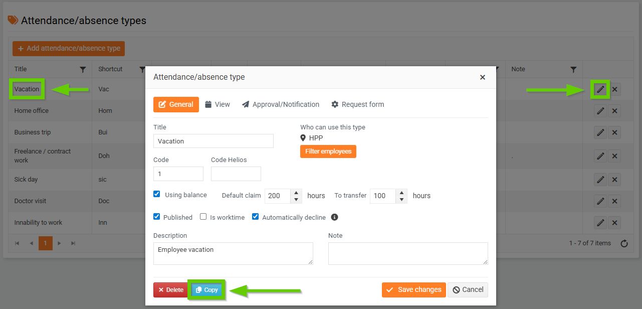 If you need to create an attendance/absence type similar to one that already exists, you do not have to create it all over again. Just click the pencil icon on the existing entry and then click the Copy button in the window that opens.