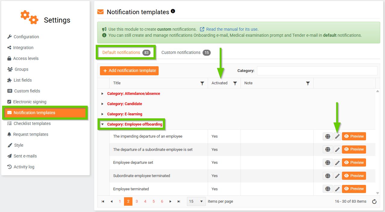 The Activated column informs you whether the notification is activated/published for automatic distribution.