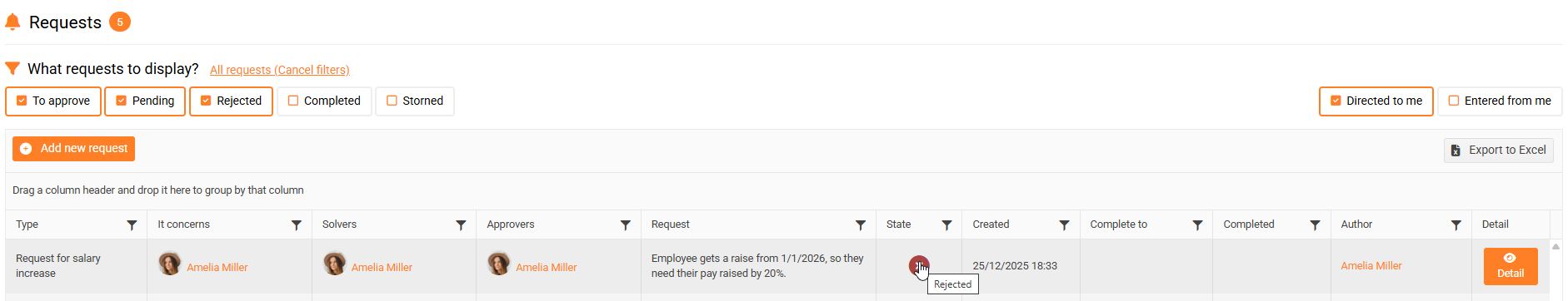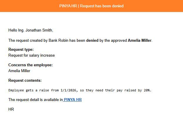 The requester will receive an email notification that their request has been rejected. The same notification is also sent to any other notified persons.