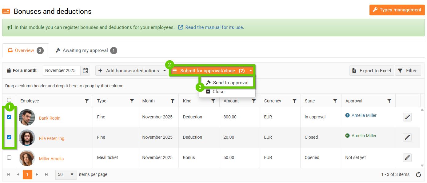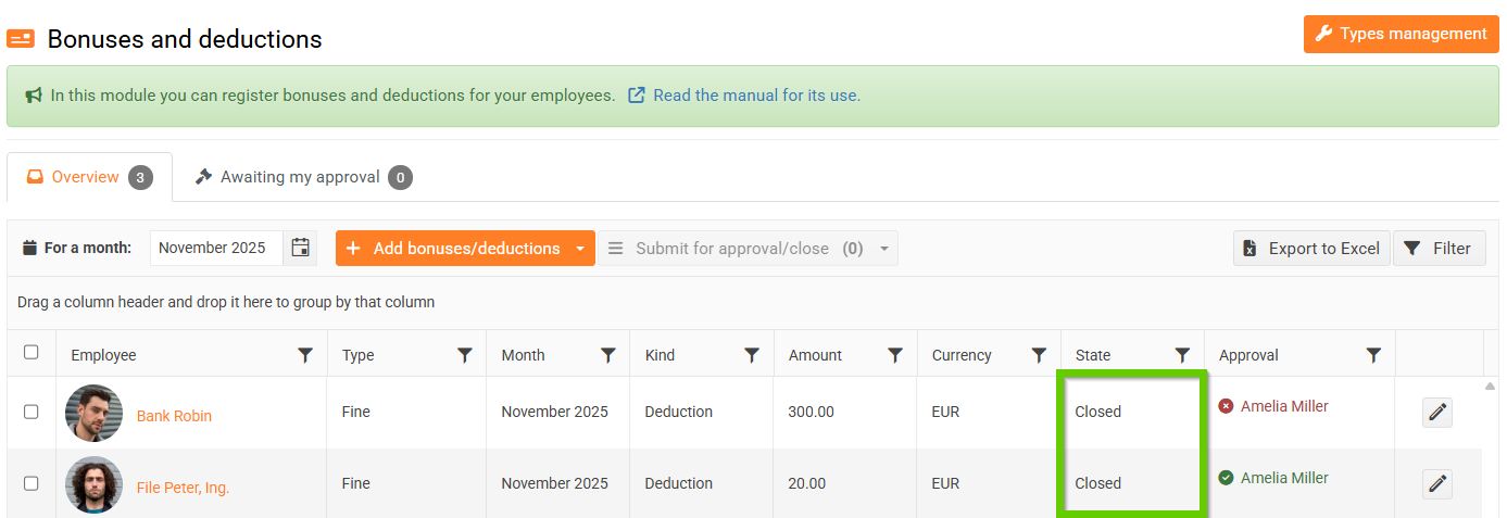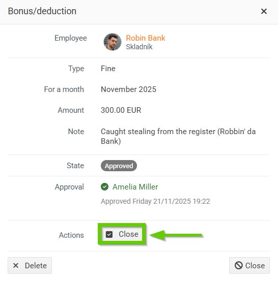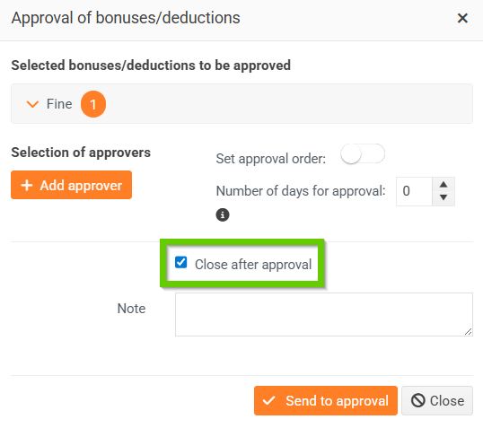 To automatically close the bonus/deduction after approval, leave the Close after approval checkbox checked. You can find it on the bonus/deduction approval form.