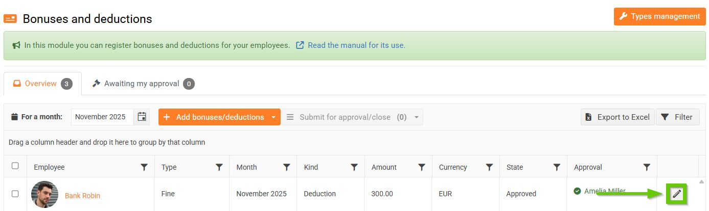 In the overview, click the pencil icon next to the desired record to access the bonus/deduction details.