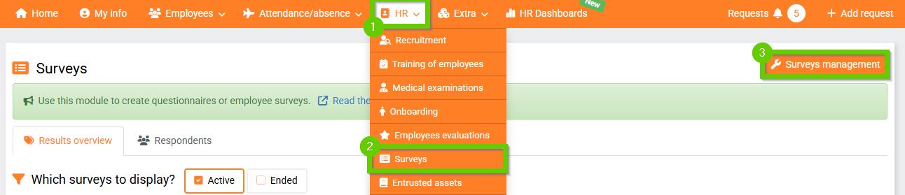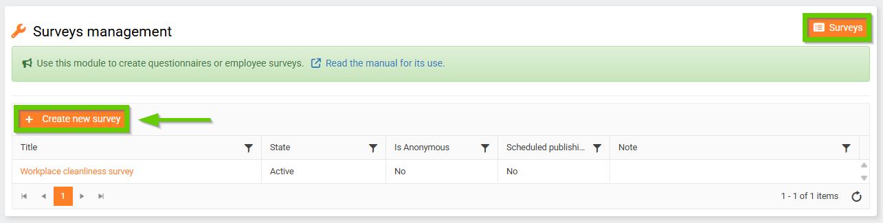 Creating a new survey requires setting the Survey management permission (see the Permissions for the surveys module chapter).