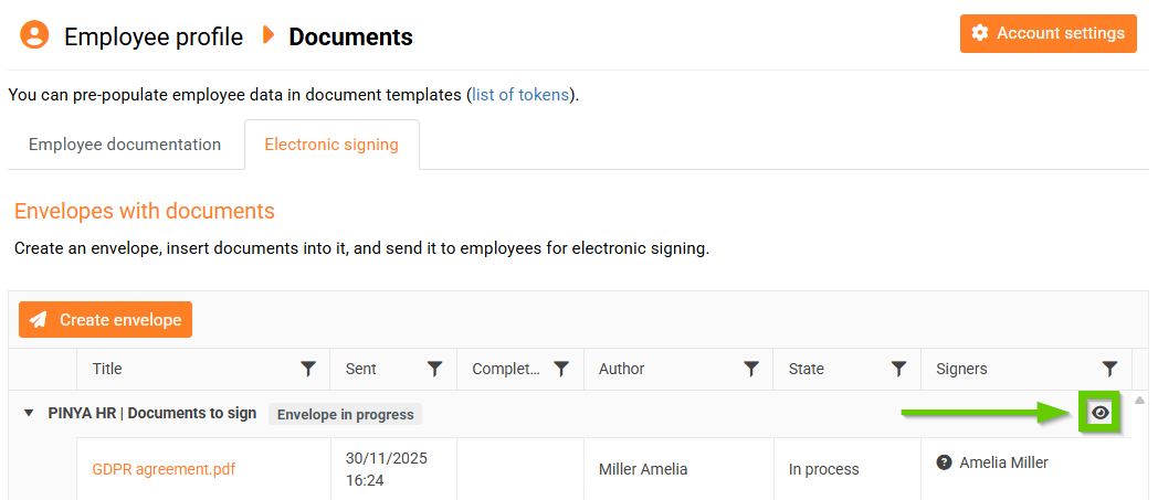 - On the Documents tab on the worker's profile , select the envelope with the In Process status (may be with or without an exclamation mark).