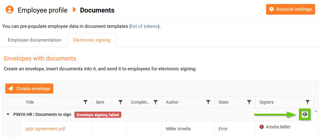 - On the Documents tab on the worker's profile , select the envelope with the document in the Error status.