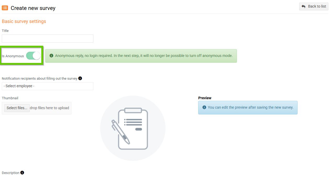 - Then, fill in the basic information as you would for a regular survey (see the chapter Creating a new survey and configuring it ).Anonymous surveys cannot include attachments or images in the survey description.
