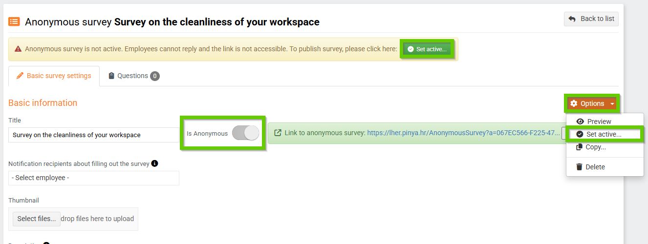 - Activate the survey using the Activate button in the top yellow bar or in the Options menu: