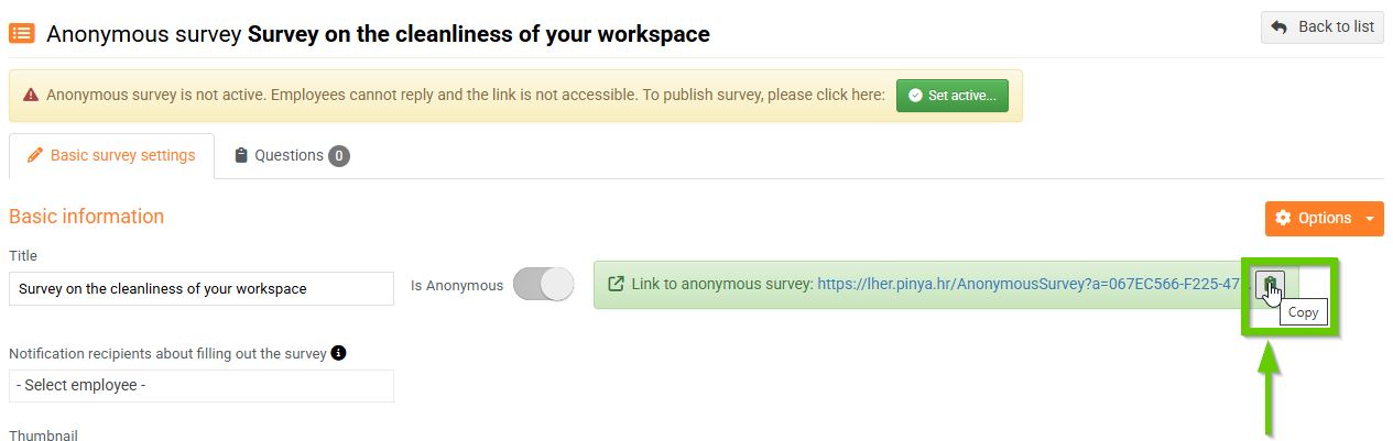 - For an active survey, copy the link using the Copy button and distribute it as needed - you can use, for example, a news item or a quick link on the home page in Pinya HR, but you can also distribute the link to the survey completely outside of Pinya, e.g. by email, on your company's intranet pages, etc.
