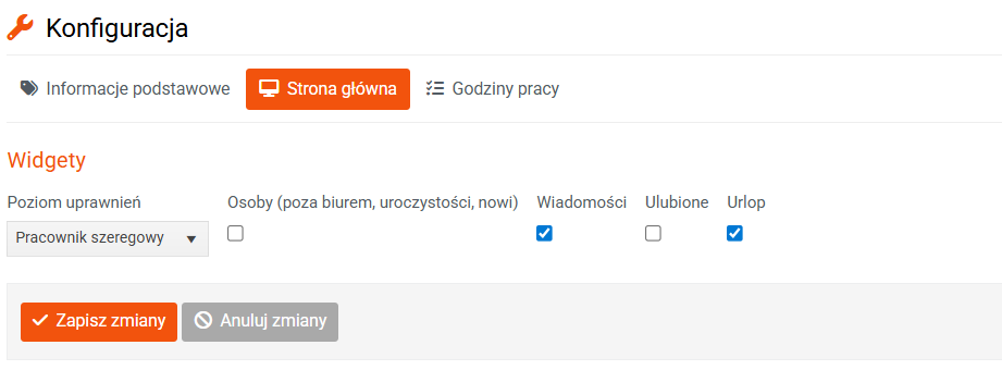 Dla każdego poziomu uprawnień można ustawić odmienny wygląd strony głównej – dla opcji Ludzie, Wiadomości, Szybkie linki i Wakacje.