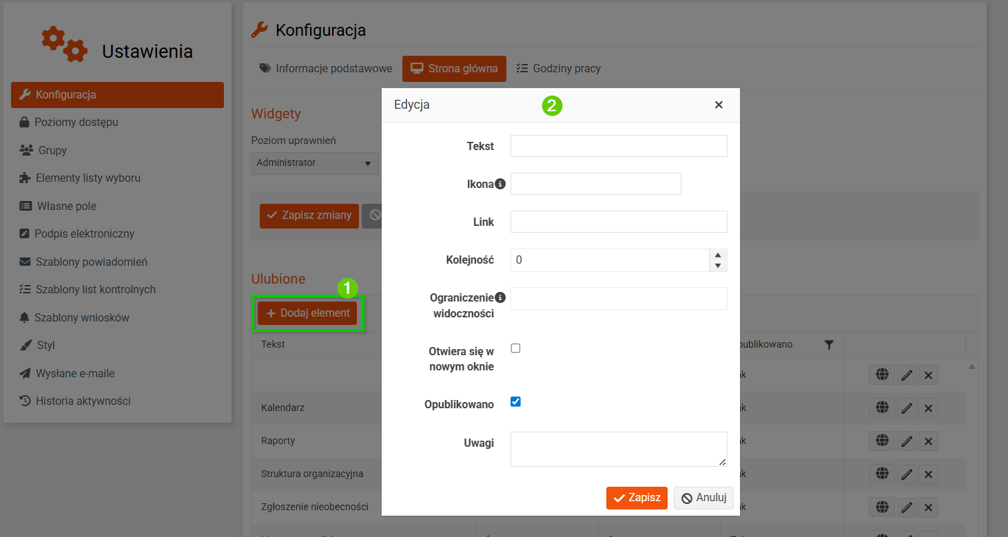 Aby dodać nowy link, kliknij przycisk Dodaj element. Otworzy się okno dialogowe, w którym możesz wpisać wymagane informacje i zapisać wpis.