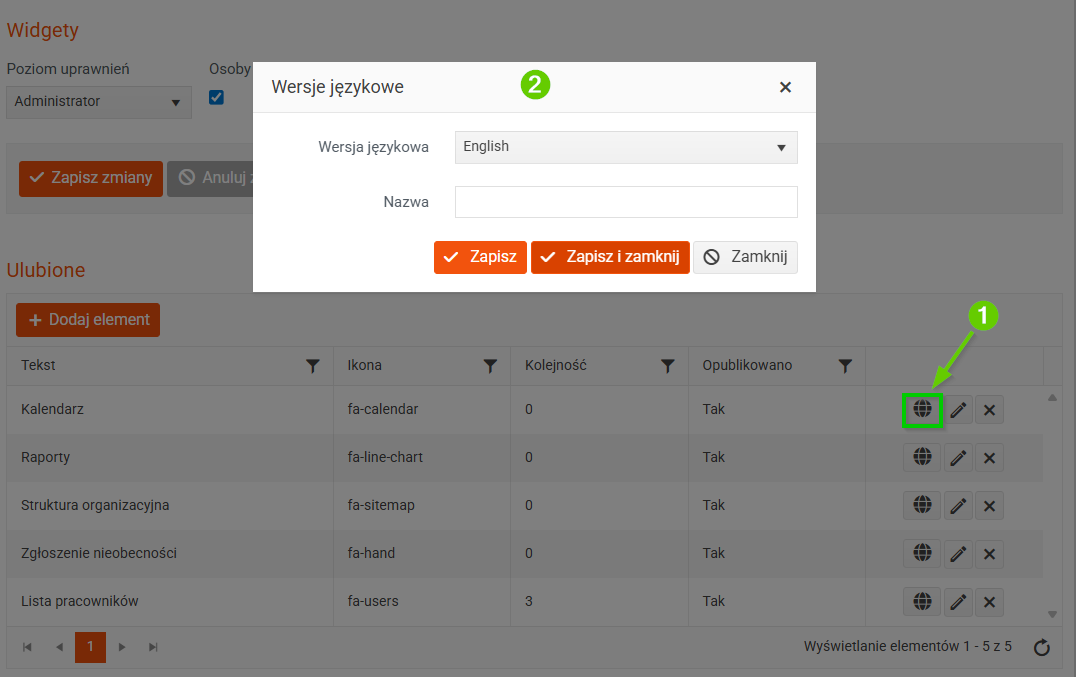 Aby ustawić wersję językową kliknij na ikonę globusa. Otworzy się okno dialogowe, w którym możesz wybrać żądany język i wpisać nazwę. Następnie zapisz wpis i zamknij okno.