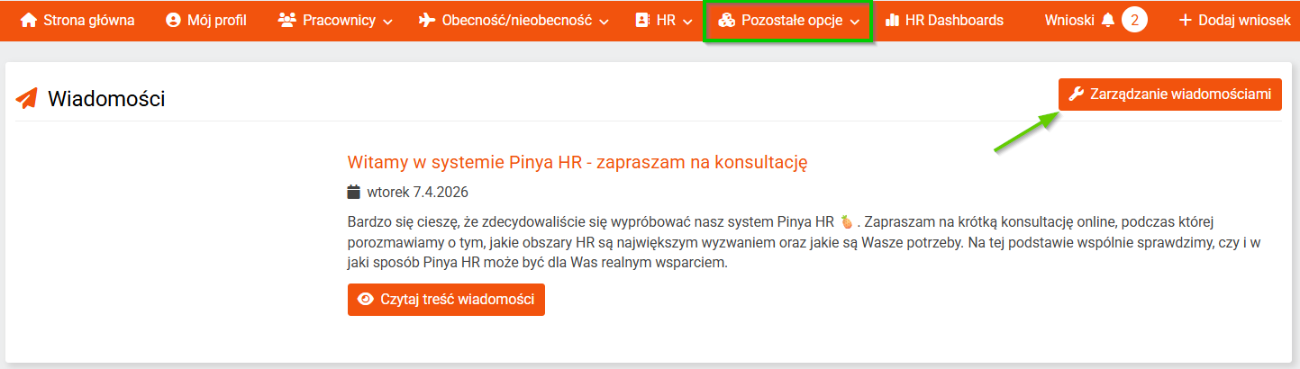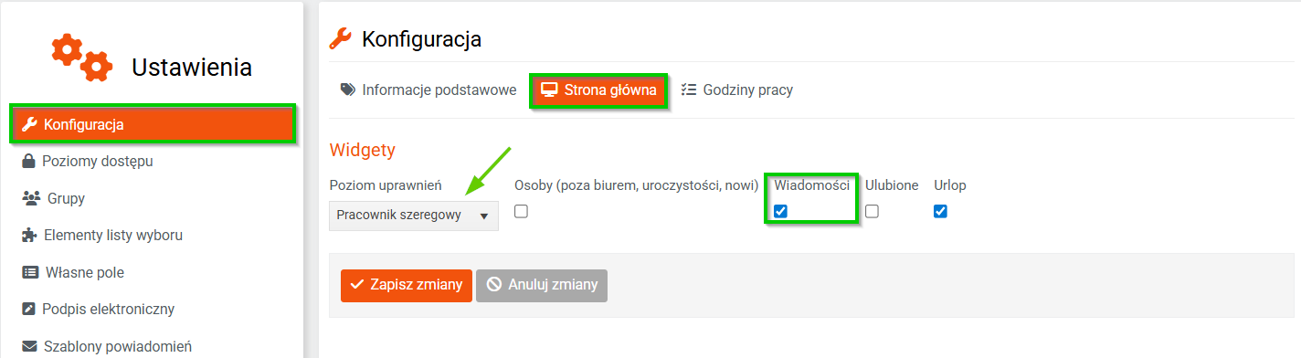 Aby zmienić ustawienia wyświetlania sekcji Wiadomości na stronie głównej PINYA HR dla wszystkich lub poszczególnych poziomów kont, przejdź do głównych ustawień systemu > Konfiguracja > Strona główna.