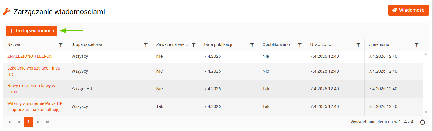 Nową wiadomość można dodać, klikając przycisk Dodaj wiadomość.
