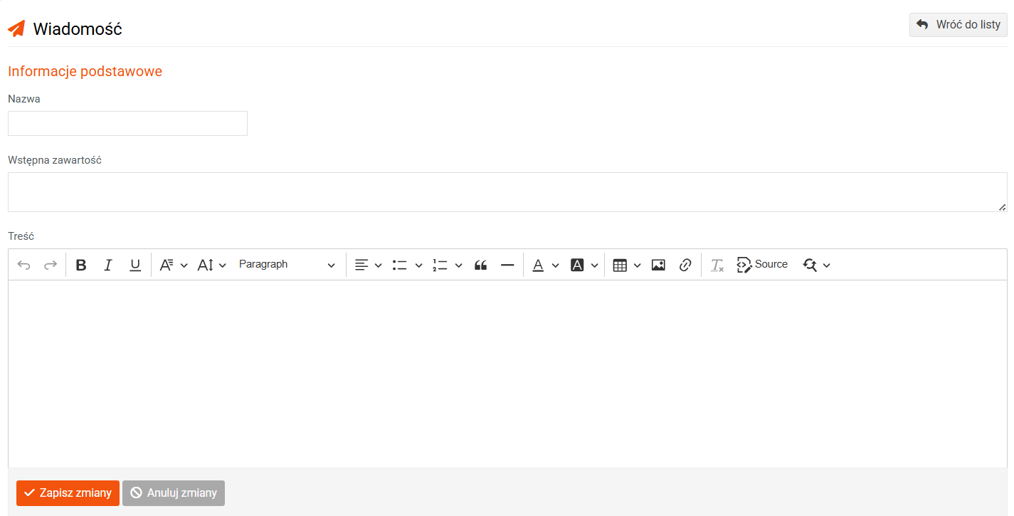 Zarządzanie wiadomościami umożliwia dodanie nowej wiadomości lub zarządzanie już utworzonymi wpisami.