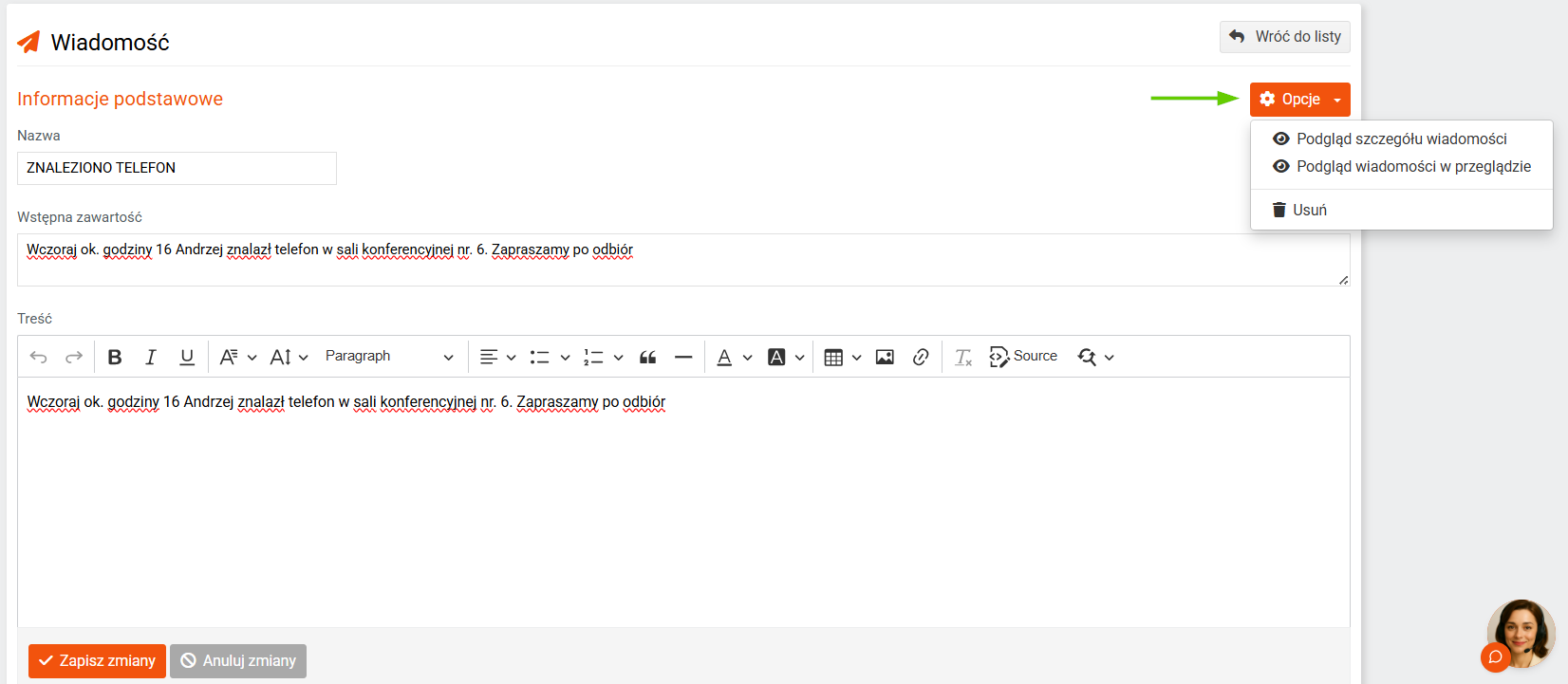 Jeśli chcesz dodatkowo edytować wiadomość kliknij jej nazwę na liście wiadomości a następnie wprowadź potrzebne zmiany.